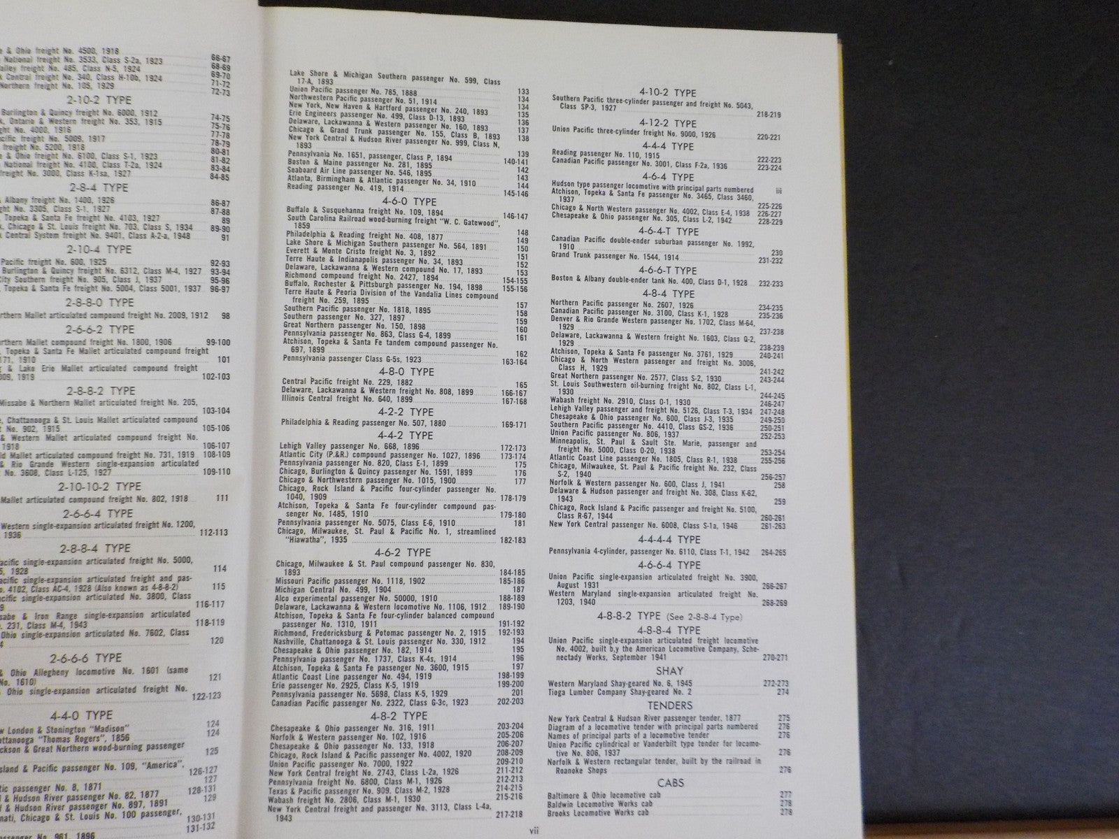 Primarily intended for use of steam railroad model builders, the illustrations were selected for their clarity in reproduction so that anyone familiar with the use of a simple scale can readily recreate a desired type of locomotive in miniature. in nearly all examples the elevation drawings have sufficient dimensions that can be measured and divided into their proper scale components. This can conveniently be done by marking along the edge of a straight piece of paper the desired dimension taken from the elevation drawing and dividing the line into the number of feet shown. By subdividing the end portion into 12 equal parts a reasonably good scale will result, enabling the model builder to lay his improvised scale upon any undimensioned part of the drawing and obtain a direct reading in feet and inches. If the elevation drawings, cross sections, and photographs are carefully followed, a capable model builder should be able to reproduce a miniature locomotive closely resembling the original illustrated in the book and with better results than is generally found in amateur model-building work. The various types of steam locomotives are grouped according to wheel arrangement, beginning with the supplest in the Whyte system, and the different individual locomotives under a particular wheel arrangement category are shown in chronological order. Numerous model builders have requested plans of the 4-4-0 type of locomotive which for many years was the standard type used in both freight and passenger service in the United States. It is known as the Eight-Wheel or American type and we have included a variety of them dating from 1856 to 1914. Steam locomotive construction for domestic use came to a complete halt in 1949 because of the replacement of steam motive power by diesel-electric locomotives. Most of the modern types of steam locomotives still in use are modifications of older types with the substitution of four-wheel for two-wheel trailing trucks. In early types, the firebox was suspended between the engine frames, and, being limited by the frame clearances, necessarily was narrow and practically governed the grate area obtainable. About the year 1881 some locomotives were built having the fire-box foundation rings raised to the top of the frames and widened to occupy the entire width between the driving wheels. This made possible a substantial increase of grate area and heating surface which added to the steaming capacity of the boiler. The Wootten type boiler with a large grate area for burning anthracite was introduced on the Philadelphia & Reading in 1878. At the present time little anthracite is burned in locomotives.