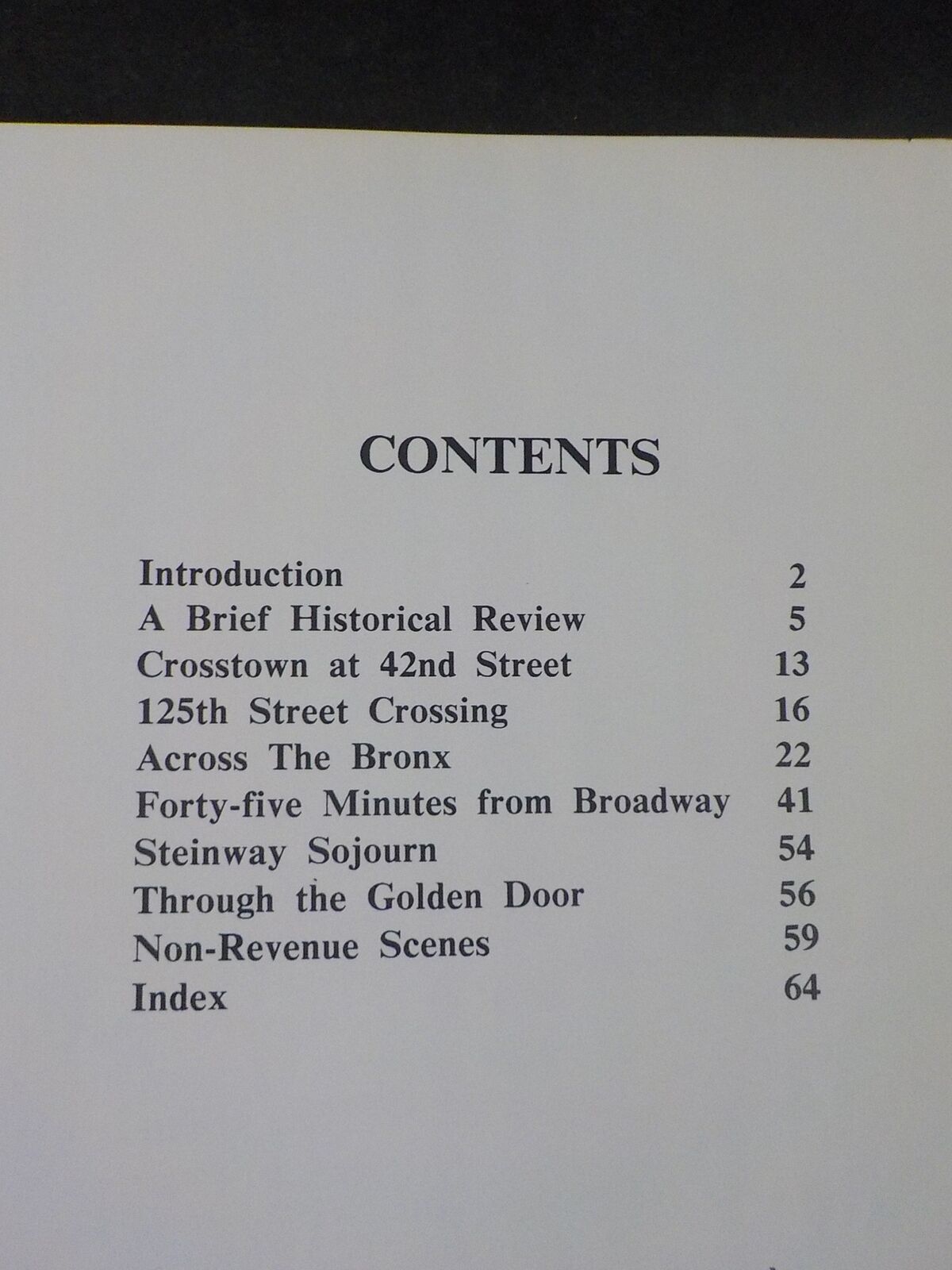 Contents: a brief historical review, Crosstown at 42nd Street, 125th Street Crossing, Across the Bronx, Forty Five minutes from Broadway, Steinway Sojourn, Through the Golden Door, Non-revenue scenes, index, photos, more.  64 pages.