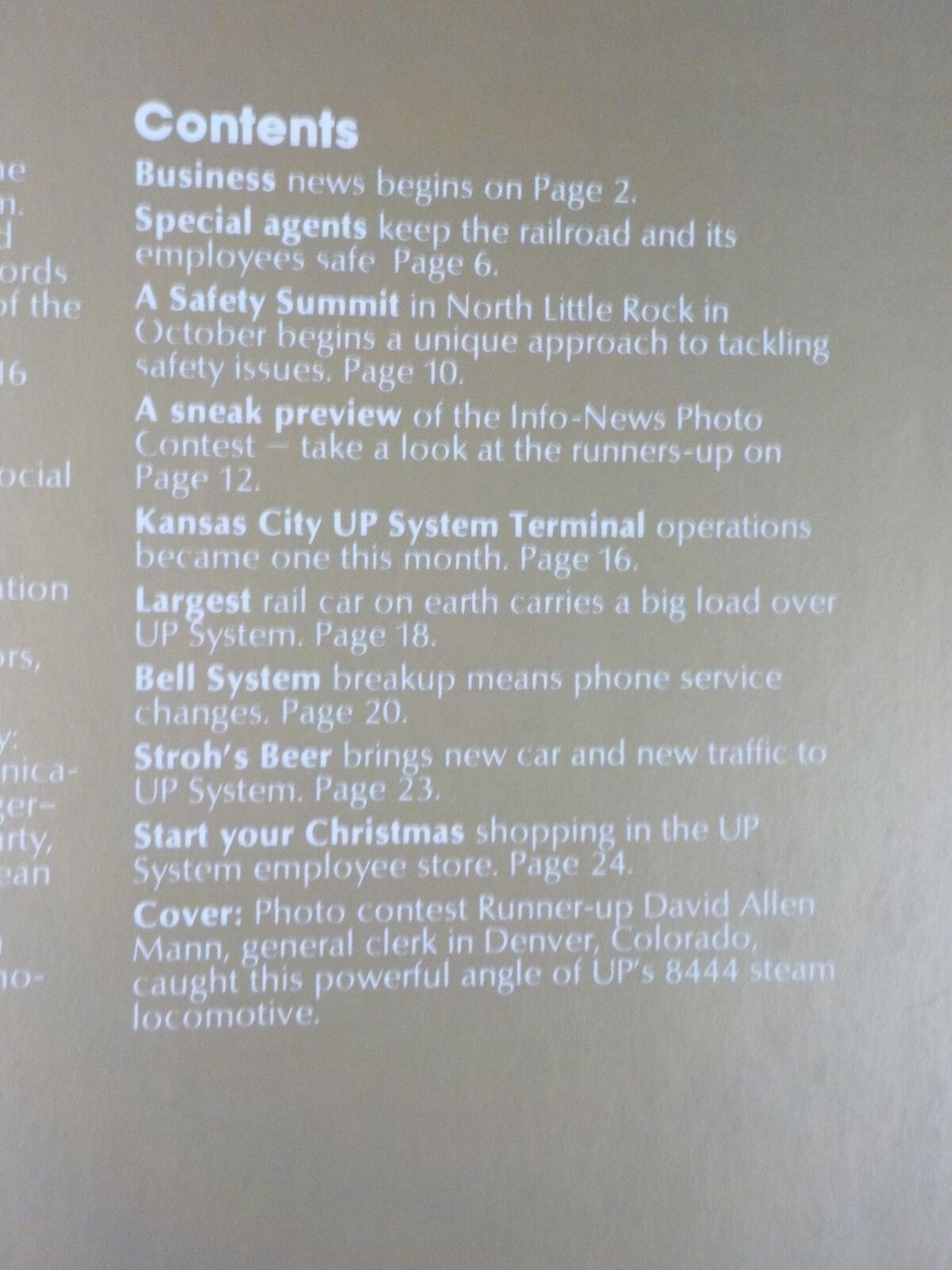 Info News is published monthly for the employees of Union Pacific and Missouri Pacific Railroads. Cover: Photo contest Runner-up David Allen Mann, general clerk in Denver, Colorado, caught this powerful angle of UP's 8444 steam locomotive.