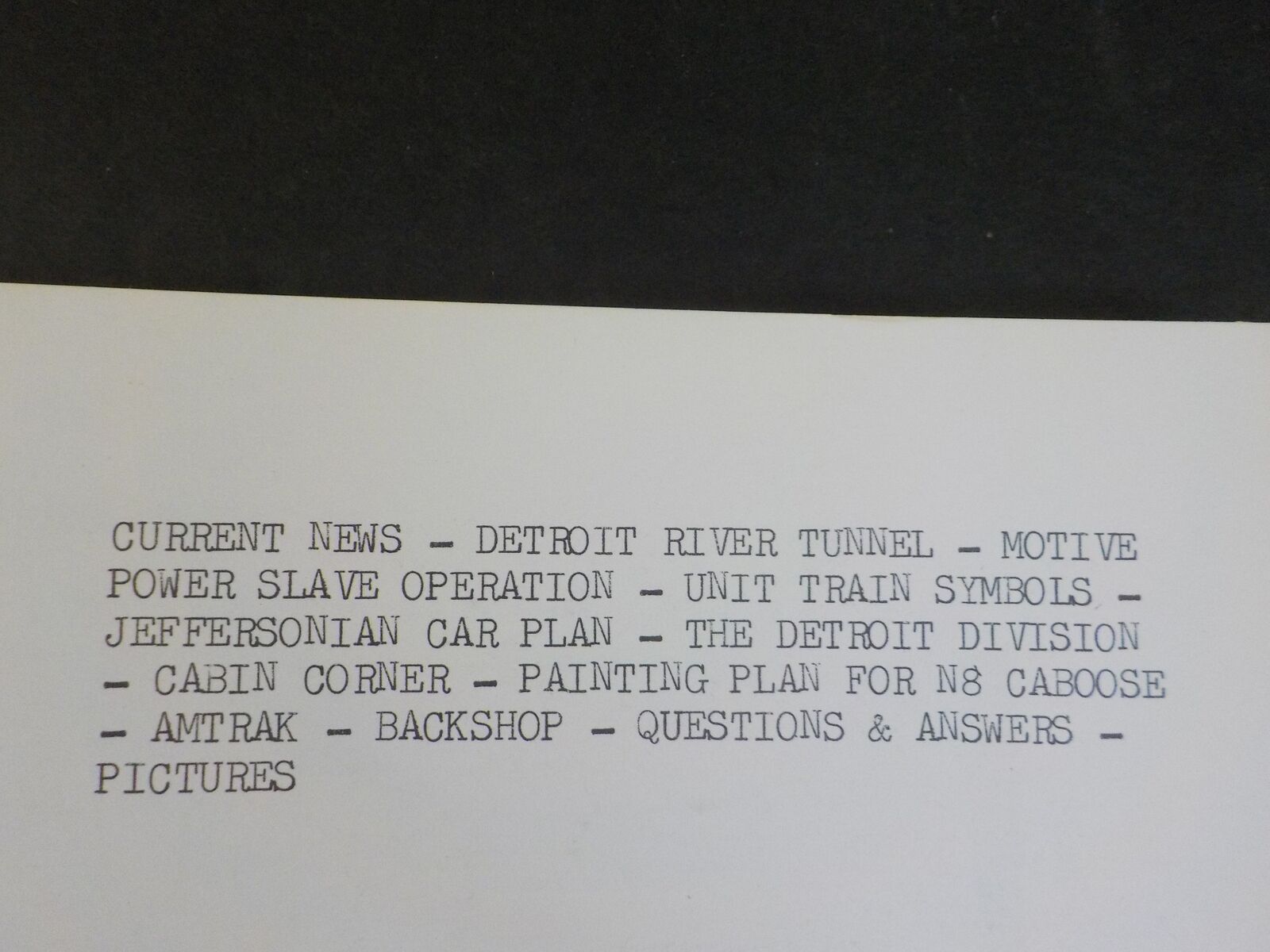 CURRENT NEWS - DETROIT RIVER TUNNFT, - MOTIVE POWER SLAVE OPERATION - UNIT TRAIN SYMBOLS -JEFFERSONIAN CAR PLAN - THE DETROIT DIVISION CABIIN CORNER - PAINTING PLAN FOR N8 CABOOSE AMTRAK - BACKSHOP - QUESTIONS & ANSWERS - & More