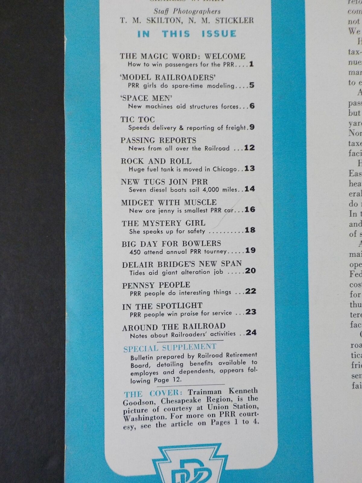 Pennsy Employee Magazine is by the Pennsylvania Railroad Company. Cover, Trainman Kenneth Goodson, Chesapeake Region, is the picture of courtesy at Union Station, Washington. For more on PRR courtesy, see the article on Pages 1 to 4.