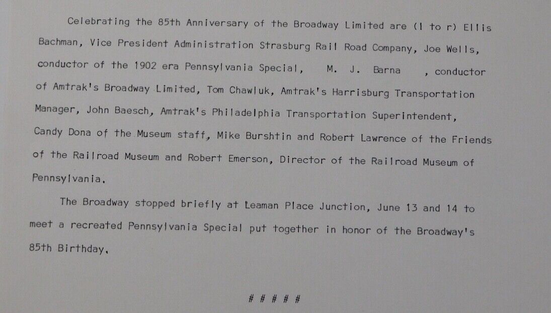 Photo Amtrak’s Broadway Limited 85th Anniversary Photo 1987 8x10