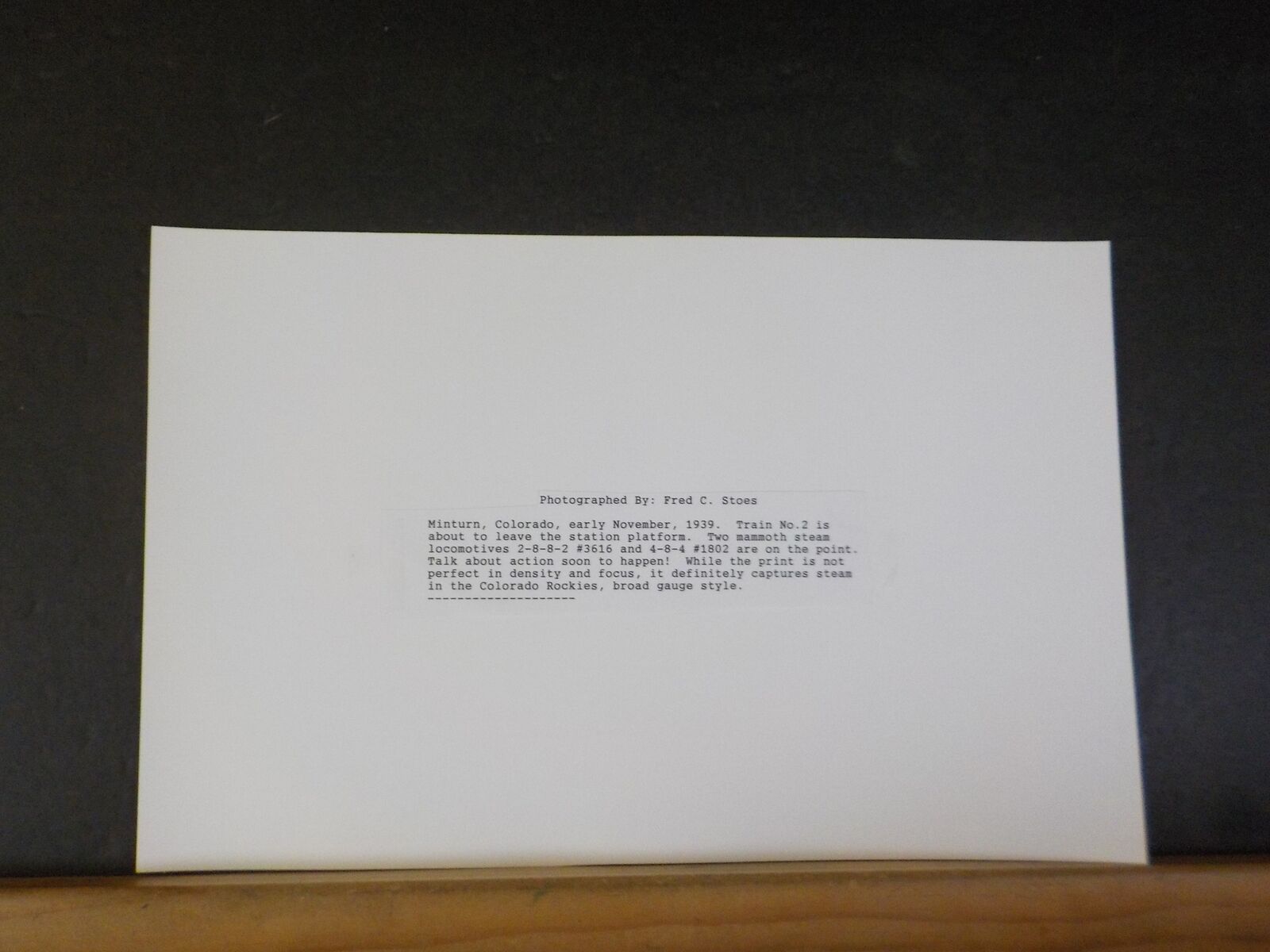 Minturn, Colorado, early November, 1939. Train No.2 is about to leave the station platform. Two mammoth steam locomotives 2-8-8-2 #3616 and 4-8-4 #1802 are on the point. Talk about action soon to happen! While the print is not perfect in density and focus, it definitely captures steam in the Colorado Rockies, broad gauge style.