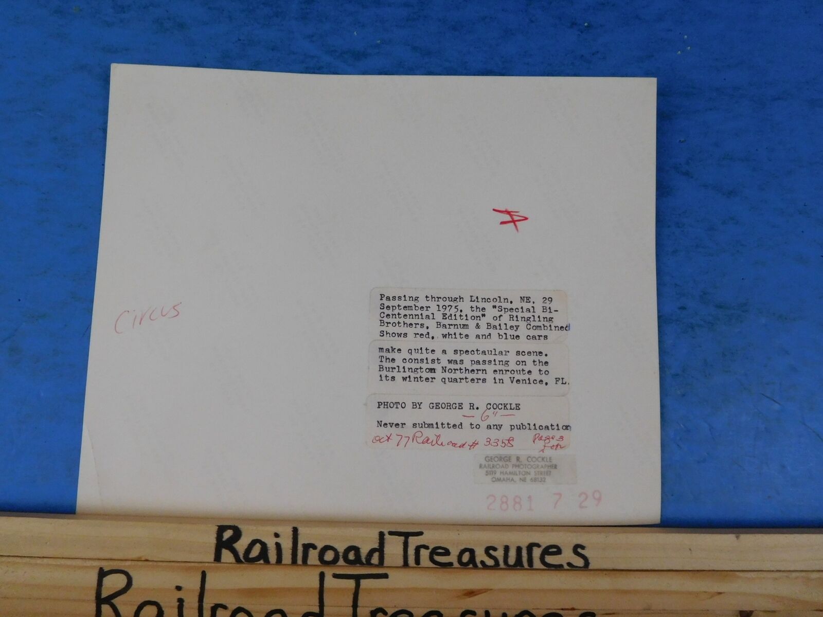 Passing through Lincoln, NE, 29 September 1975, the Special Bi-Centennial Edition of Ringling Brothers, Barnum & Bailey Combined Shows red, white and blue cars make quite a spectacular scene. The consist was passing on the Burlington Northern enroute to its winter quarters in Venice, FL.