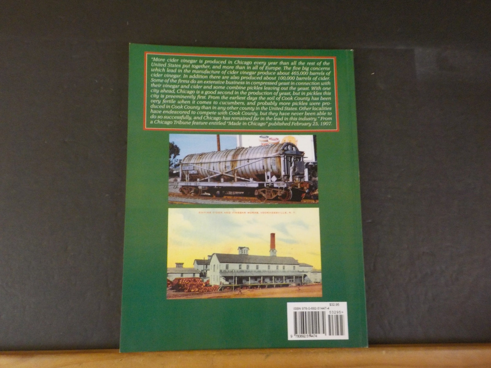 "More cider vinegar is produced in Chicago every year than all the rest of the United States put together, and more than in all of Europe. The five big concerns which lead in the manufacture of cider vinegar produce about 465,000 barrels of cider vinegar. In addition there are also produced about 100,000 barrels of cider. Some of the firms do an extensive business in compressed yeast in connection with their vinegar and cider and some combine pickles leaving out the yeast. With one city ahead, Chicago is a good second in the production of yeast, but in pickles this city is preeminently first. From the earliest days the soil of Cook County has been very fertile when it comes to cucumbers, and probably more pickles were produced in Cook County than in any other county in the United States. Other localities have endeavored to compete with Cook County, but they have never been able to do so successfully, and Chicago has remained far in the lead in this industry." From a Chicago Tribune feature entitled "Made in Chicago" published February 25, 1907.