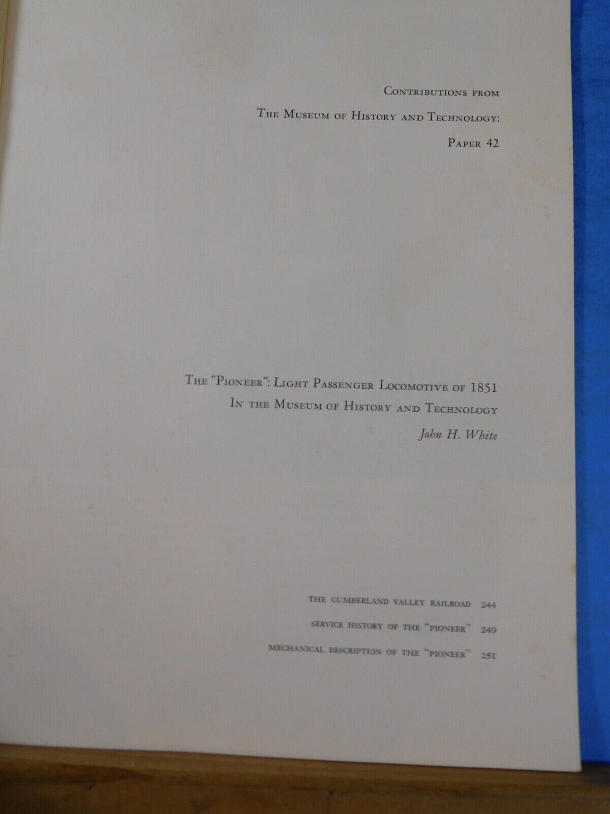The Pioneer Light Passenger Locomotive of 1851 by White US National Museum Bulletin #240, paper 42, pages 241-268. The Cumberland Valley Railroad, service history of the Pioneer, mechanical description of the Pioneer. Pages 241-268. Lots of photos.