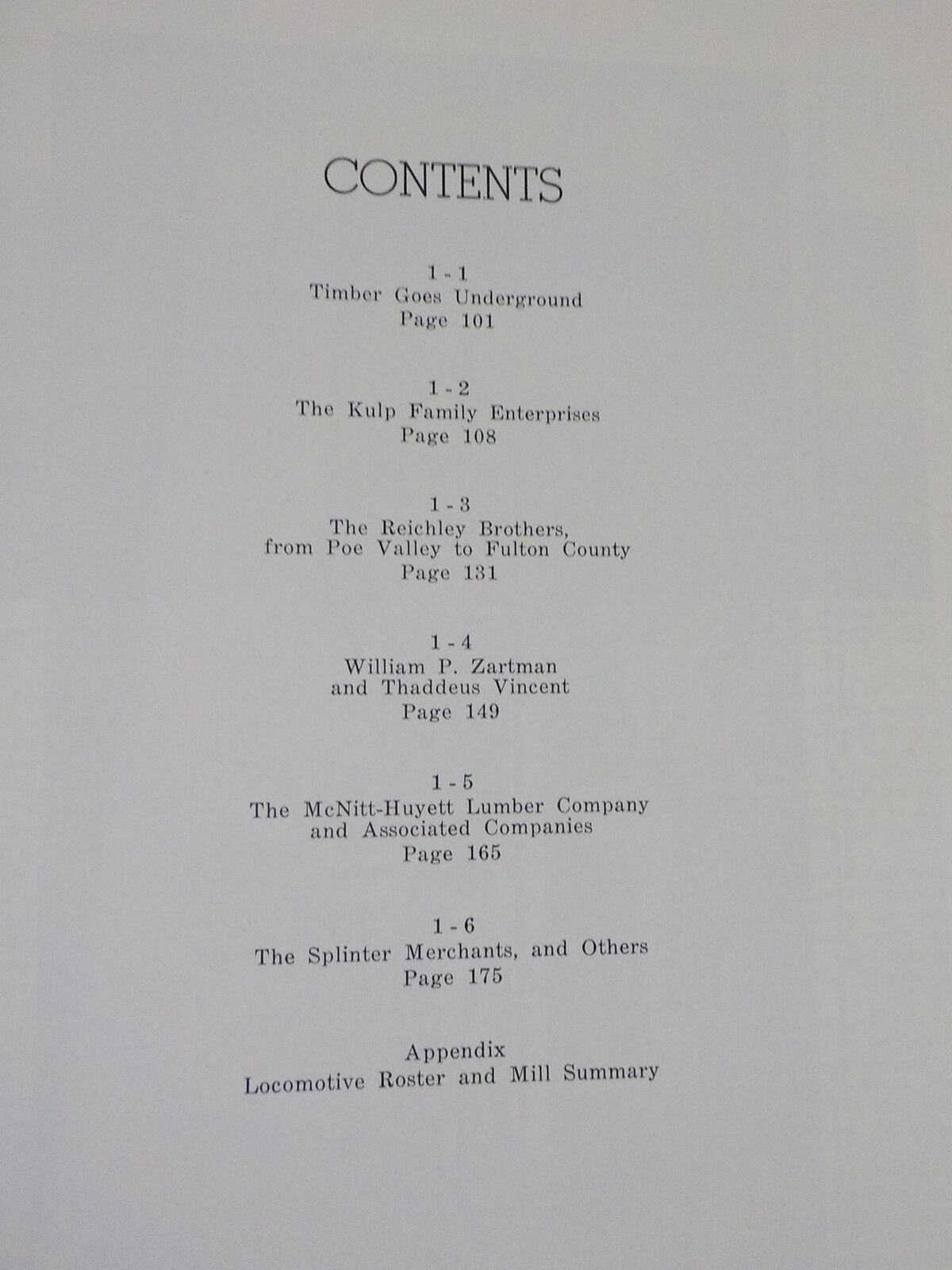 Table of Contents: timber goes underground, the Kulp Family Enterprises, the Reichley Brothers from Poe Valley to Fulton County, William P Zartman and Thaddeus Vincent, the McHitt-Huyett Lumber Company and Associated Companies, the Splinter Merchants and others, locomotive roster and mill summary.