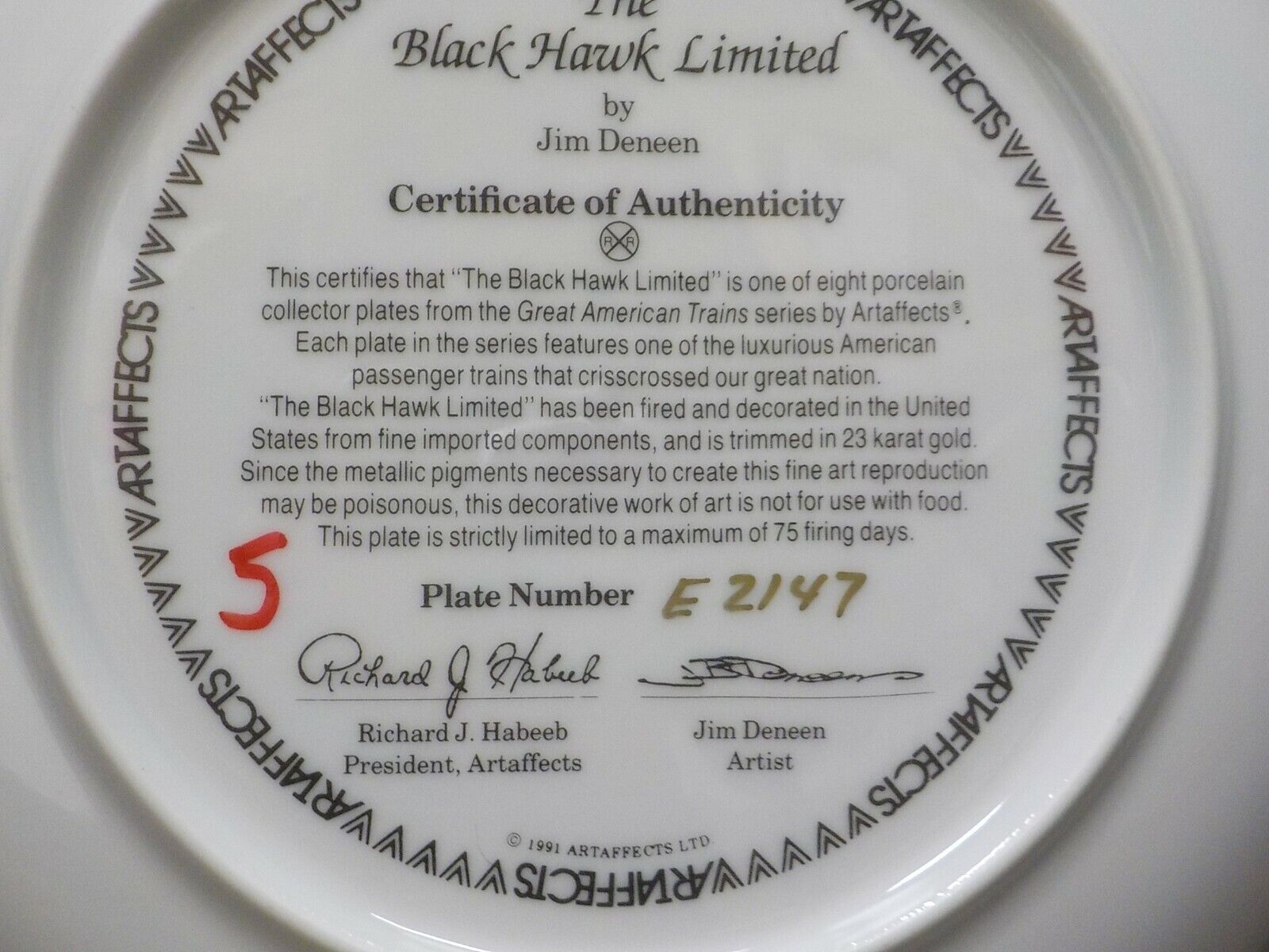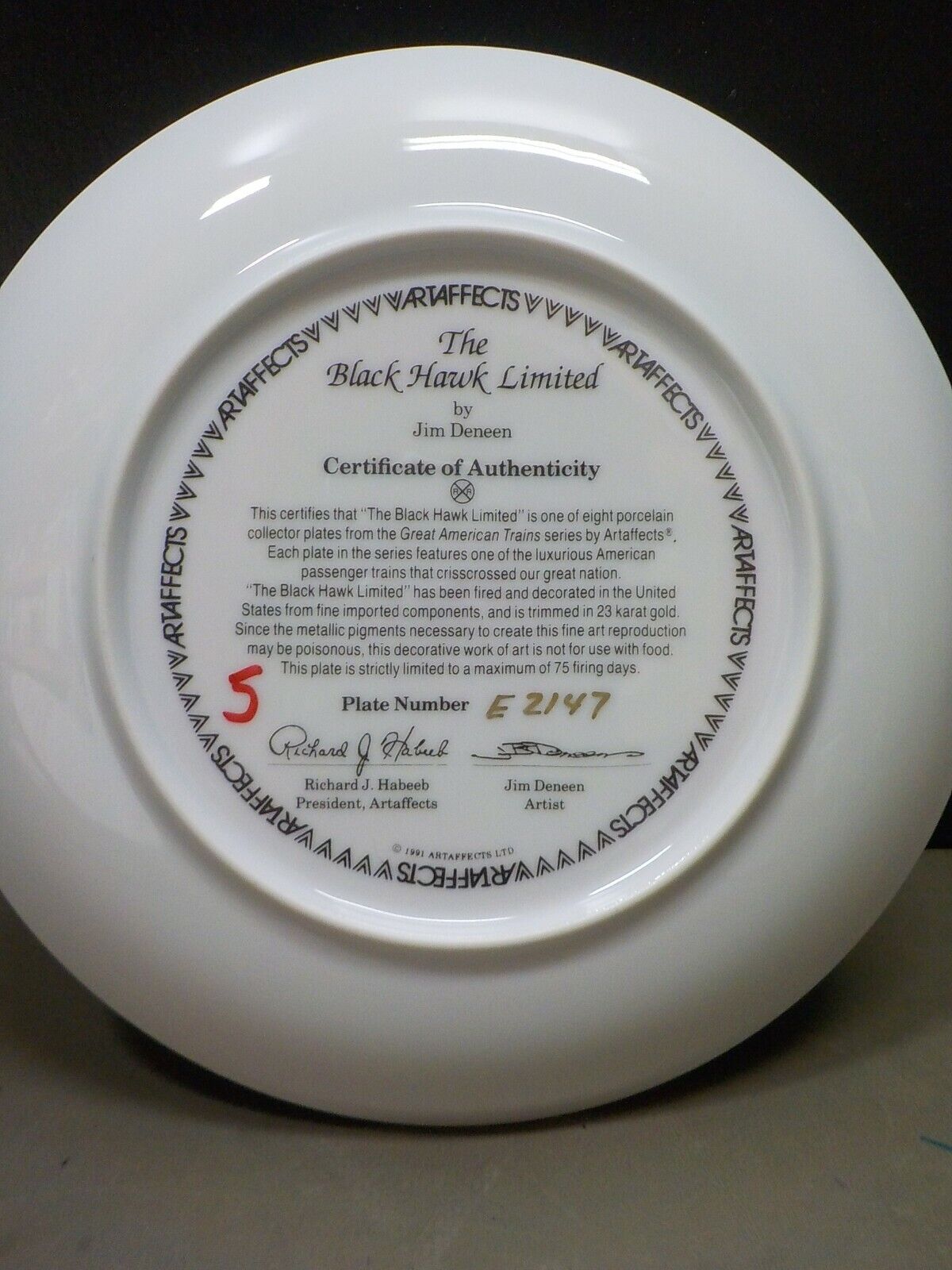 Black Hawk Limited (Great American Trains series) by Jim Deneen. Each plate in the series features one of the luxurious American passenger trains that crisscrossed our great nation. Artaffects collection 1991. Plate size approx 8 inches.