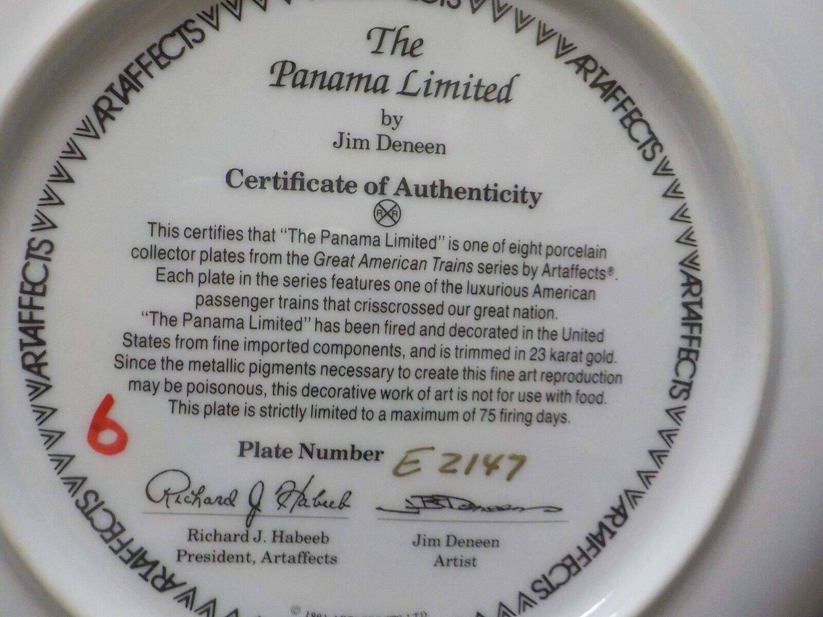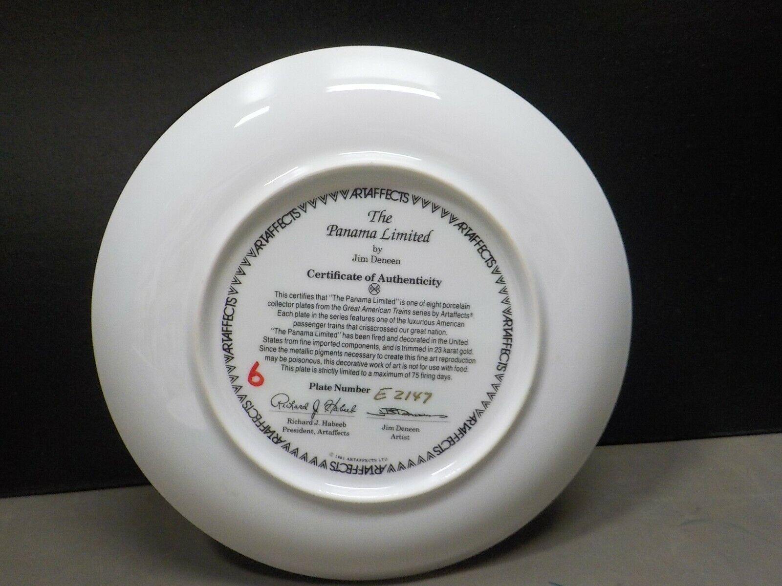The Panama Limited is one of eight porcelain collector plates from the Great American Trains series by Jim Deneen and Artaffects. Each plate in the series features one of the luxurious American passenger trains that crisscrossed our great nation "The Panama Limited' has been fired and decorated in the tinned Slates from fine imported components. and is trimmed in 23 karat gold Since the metallic pigments necessary to create this fine art reproduction may be poisonous. this decorative work of art is not for use with food. Plate size approx. 8 inches.