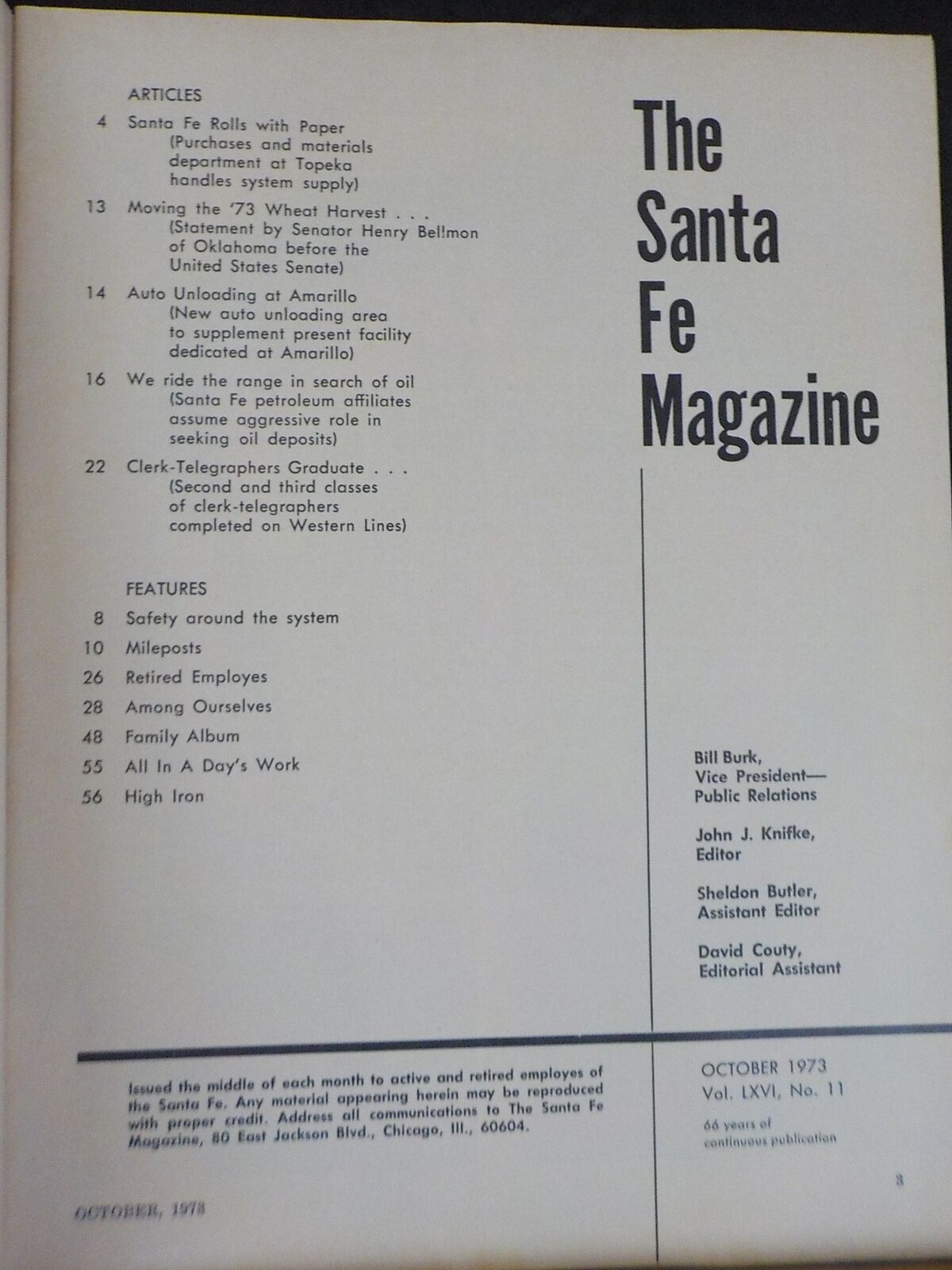 Santa Fe Employee Magazine is issued the middle of each month to active and retired employes of the Santa Fe. Our Cover: A Western sunset provides a spectacular background for an oil well rig towering over Santa Fe's Willow Draw oil field in northwestern Wyoming. Turn to Page 16 of this issue for a story on our oil exploration program. Color transparency by R. Collins Bradley, system photographer, Los Angeles, Calif.